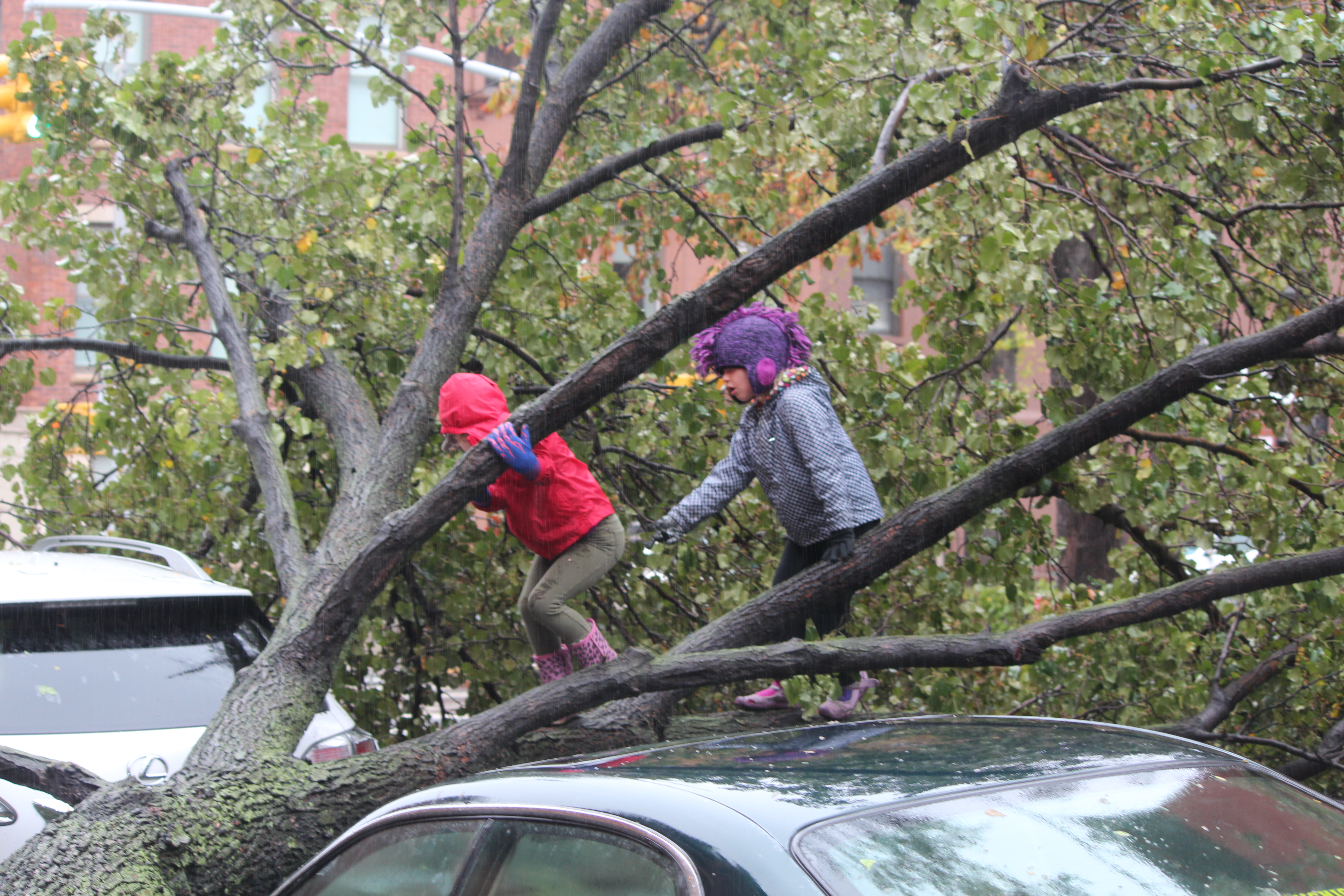 Park Slope kids climbing a tree that destroyed a car. Sterling and 7th Ave.